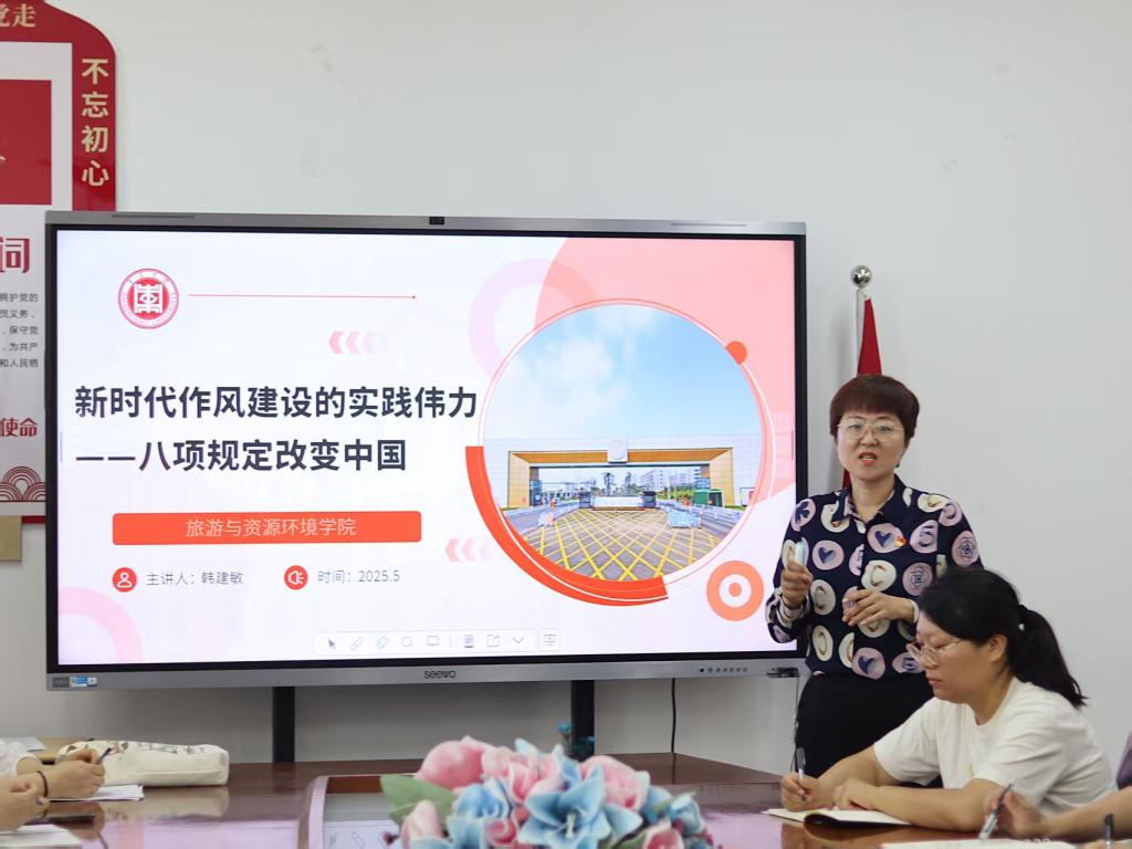 为深入贯彻中央八项规定精神学习教育,扎实推进作风建设,5月21日,旅游与资源环境学院在豁然楼A415会议室召开新时代作风建设的实践伟力——中央八项规定改变中国主题教育党课。此次党课由学院党委副书记韩建敏主持,全体辅导员、班主任参加学习。