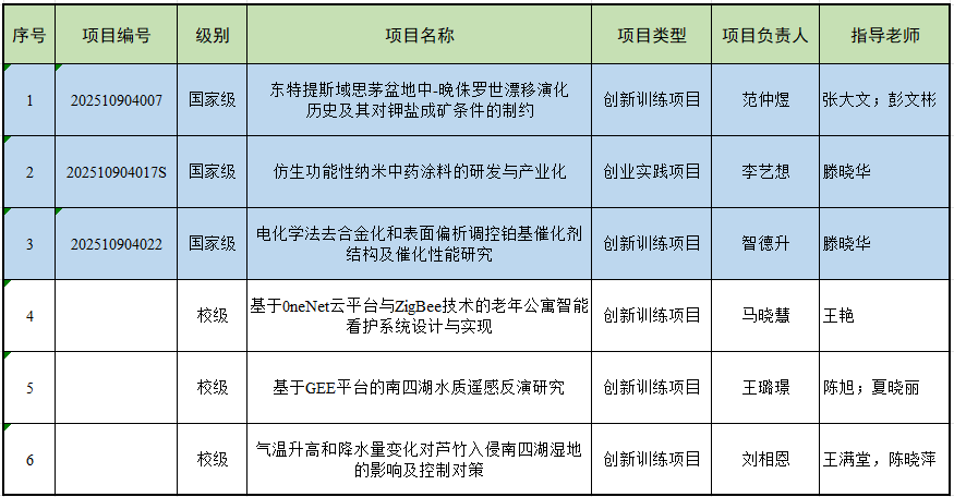 本次获批的3项国家级项目涵盖地质演化、新材料研发、能源催化等多个前沿领域,包括范仲煜同学负责的《东特提斯域思茅盆地中-晚侏罗世漂移演化历史及其对钾盐成矿条件的制约》(指导教师:张大文、彭文彬);李艺想同学负责的《仿生功能性纳米中药涂剂的研发与产业化》(指导教师:滕晓华);以及智德升同学负责的《电化学法去合金化和表面偏析调控铂基催化剂结构及催化性能研究》(指导教师:滕晓华)。此外,《基于OneNet云平台与ZigBee技术的老年公寓智能看护系统设计与实现》、《基于GEE平台的南四湖水质遥感反演研究》以及《气温升高和降水量变化对芦竹入侵南四湖湿地的影响及控制对策》获批校级立项。
