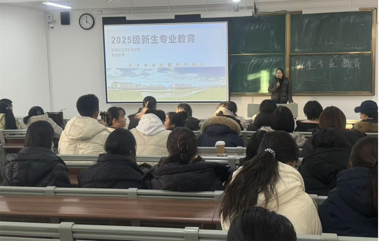 为帮助2025级旅游管理(3+2)专业新生更好地适应大学生活,深入了解所学专业,12月3日下午,旅游与资源环境学院在崇德楼207教室为2025级旅游管理(3+2)专业学生进行了专业教育,旨在为同学们提供丰富的信息和指引,助力其更好地融入大学环境、明确学习目标。教研室主任杜宜臻主讲,部分专任教师参加。