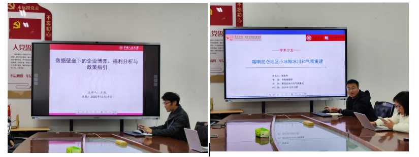 此次沙龙紧密围绕“数据”、“环境”与“治理”三大核心关键词展开。旅游与资源环境学院张宏杰博士、经济管理学院王成老师分别作了题为《喀喇昆仑地区小冰期冰川气候重建》《数据壁垒下的企业博弈、福利分析和政策指引》的学术报告。两场报告虽分属不同学科领域,却在此次沙龙的主题下产生了深刻的共鸣与对话。无论是重建历史气候所需的自然数据解码,还是优化当下经济治理面临的社会数据规制,都凸显了“数据”作为核心研究对象和研究工具的双重属性,以及“治理”思维在应对环境与社会复杂性中的关键作用。