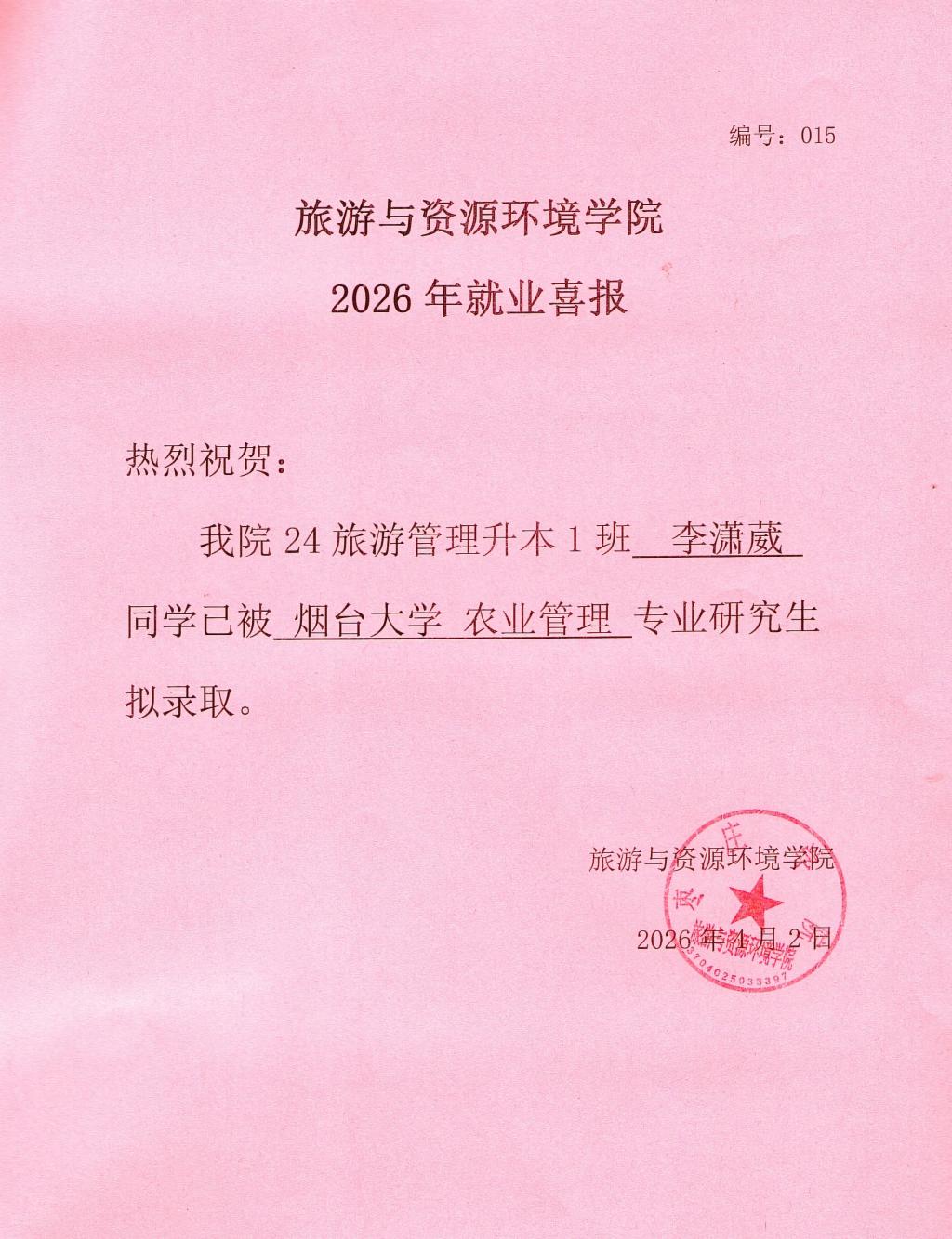 喜报!24旅游管理升本1班李潇葳被烟台大学录取!