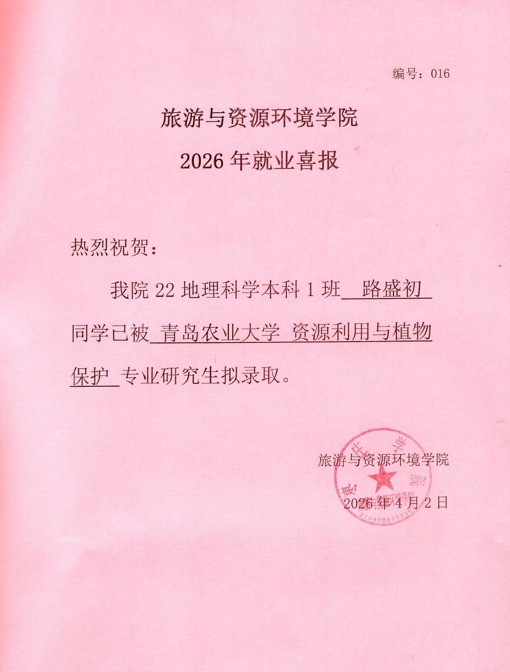 喜报!22地理科学本科1班路盛初被青岛农业大学录取!