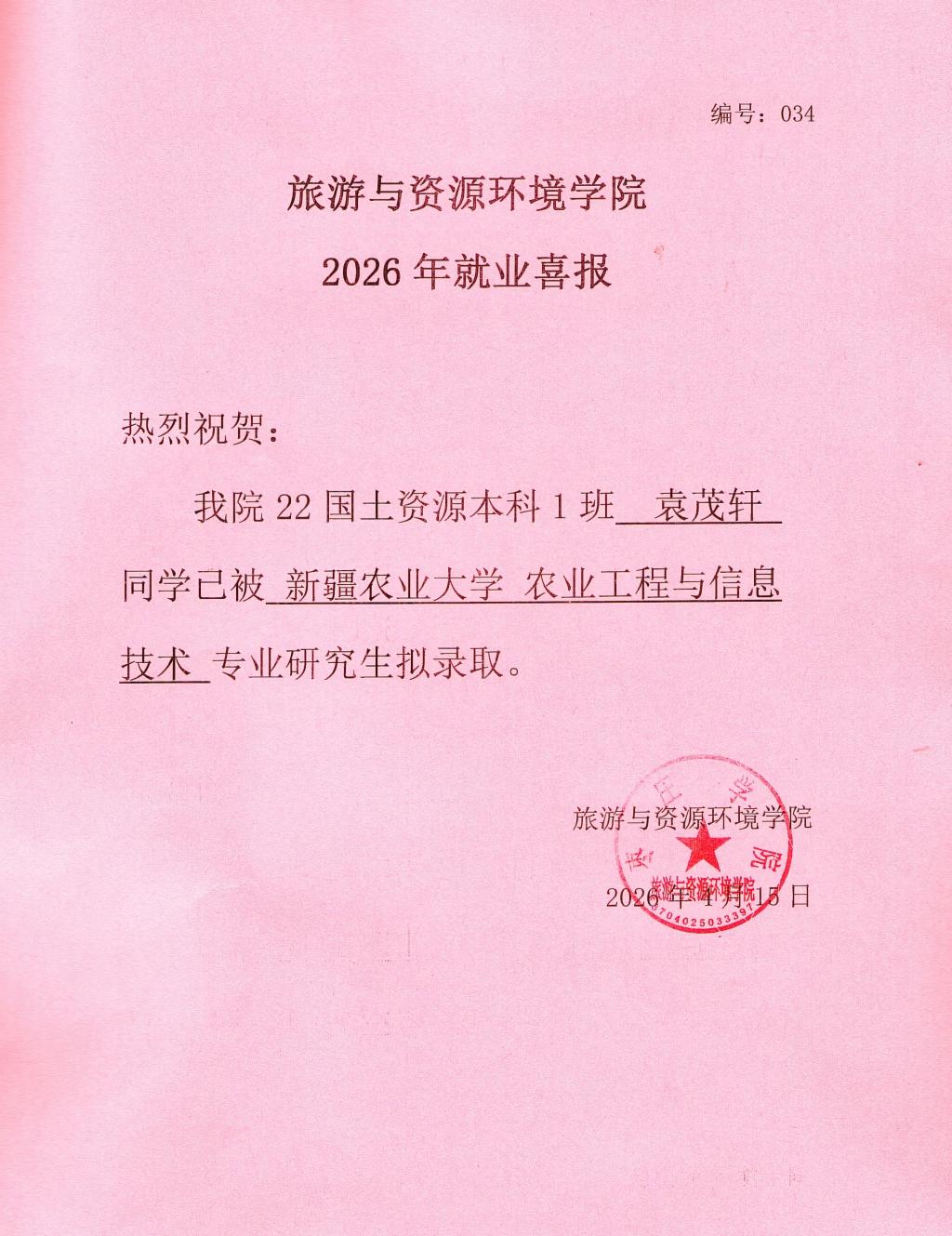 喜报!22国土资源本科1班袁茂轩被新疆农业大学录取!